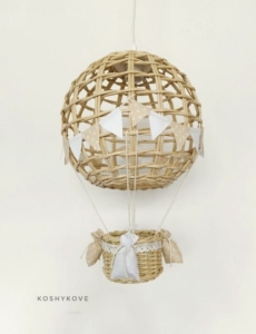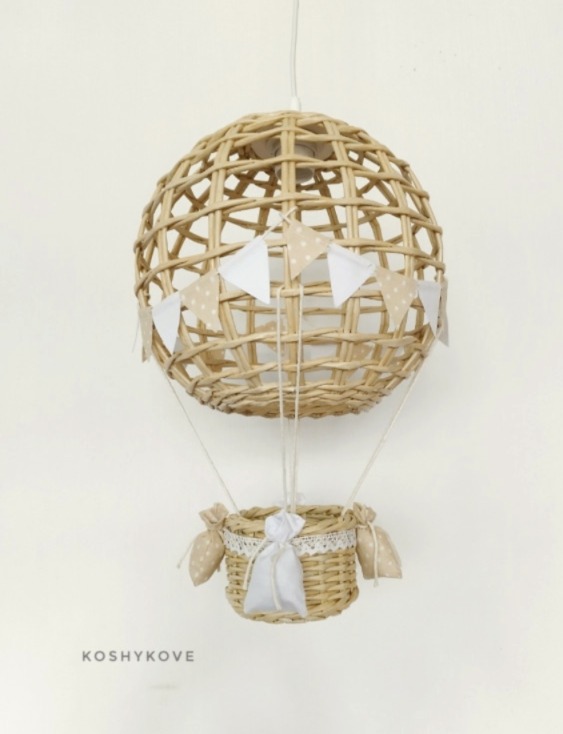 Efektowny wiszący abażur w formie latającego balona z koszem ozdobiony chorgiewkami w dowolnej kolorystyce. Doskonale sprawdzi się, jako prezent dla nowo narodzonego maleństwa. Dekoracja wykonana ręcznie z ogromną dbałością o każdy szczegół, co gwarantuje jej oryginalność i niepowtarzalny charakter.