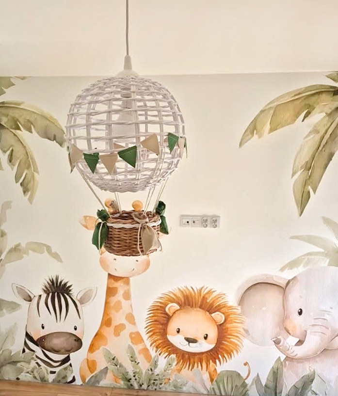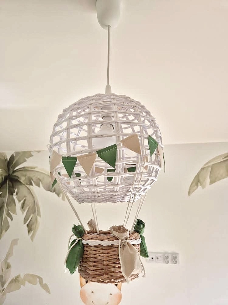 Efektowny wiszący abażur w formie latającego balona z koszem ozdobiony chorgiewkami w dowolnej kolorystyce. Doskonale sprawdzi się, jako prezent dla nowo narodzonego maleństwa. Dekoracja wykonana ręcznie z ogromną dbałością o każdy szczegół, co gwarantuje jej oryginalność i niepowtarzalny charakter.