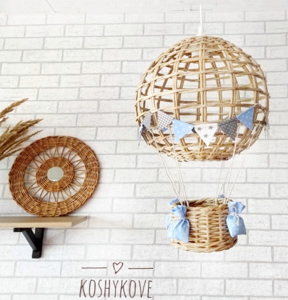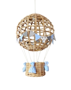 Efektowny wiszący abażur w formie latającego balona z koszem ozdobiony chorgiewkami w dowolnej kolorystyce. Doskonale sprawdzi się, jako prezent dla nowo narodzonego maleństwa. Dekoracja wykonana ręcznie z ogromną dbałością o każdy szczegół, co gwarantuje jej oryginalność i niepowtarzalny charakter.