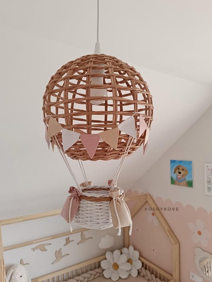 Efektowny wiszący abażur w formie latającego balona z koszem ozdobiony chorgiewkami w dowolnej kolorystyce. Doskonale sprawdzi się, jako prezent dla nowo narodzonego maleństwa. Dekoracja wykonana ręcznie z ogromną dbałością o każdy szczegół, co gwarantuje jej oryginalność i niepowtarzalny charakter.