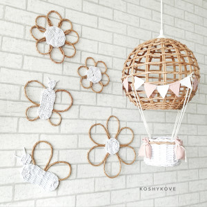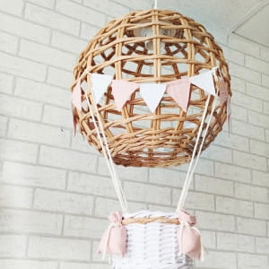 Efektowny wiszący abażur w formie latającego balona z koszem ozdobiony chorgiewkami w dowolnej kolorystyce. Doskonale sprawdzi się, jako prezent dla nowo narodzonego maleństwa. Dekoracja wykonana ręcznie z ogromną dbałością o każdy szczegół, co gwarantuje jej oryginalność i niepowtarzalny charakter.
