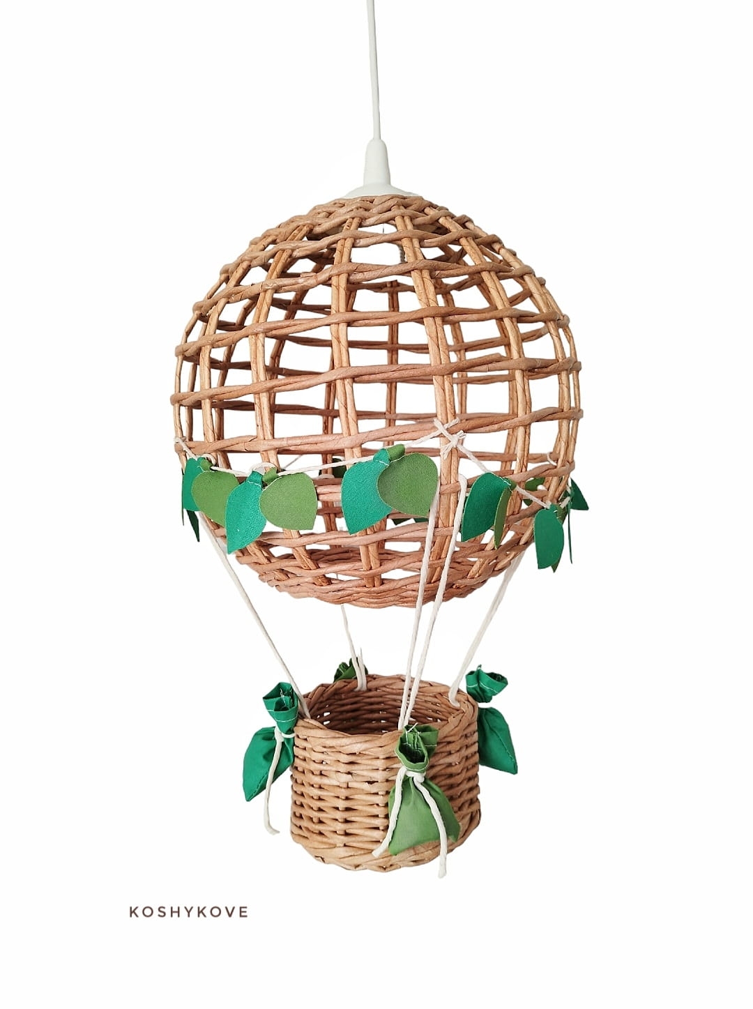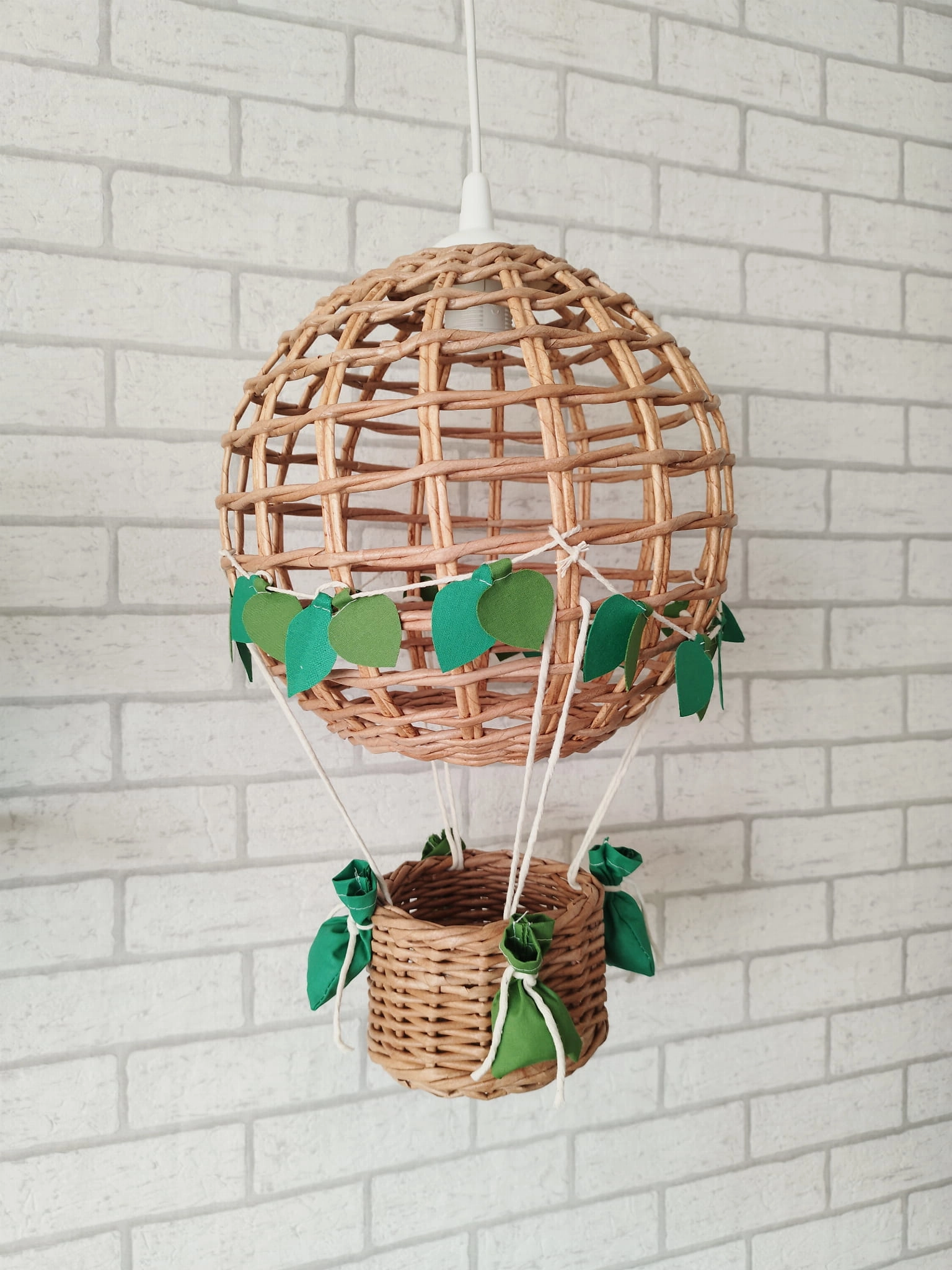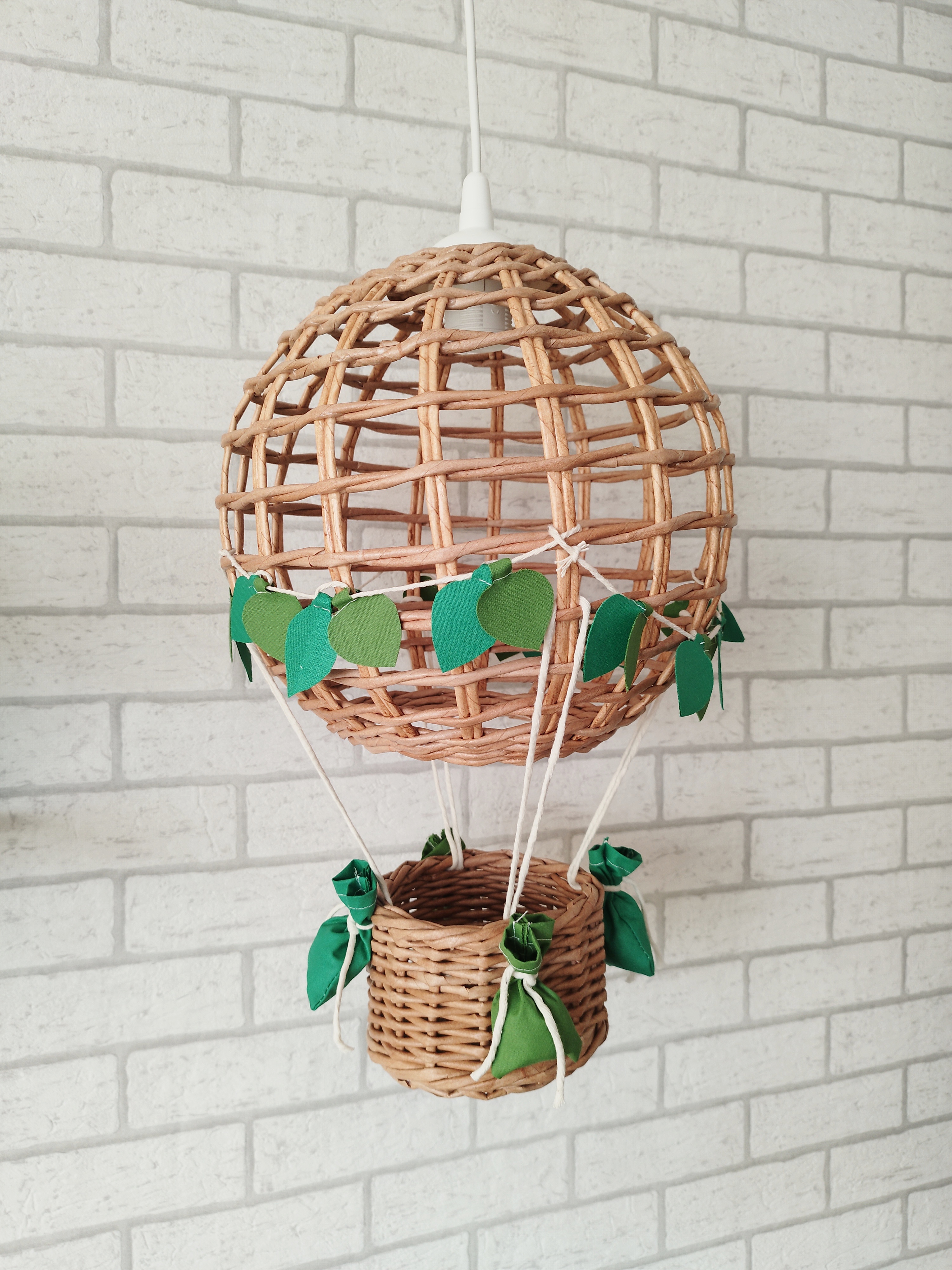 Efektowny wiszący abażur w formie latającego balona z koszem ozdobiony chorgiewkami w dowolnej kolorystyce. Doskonale sprawdzi się, jako prezent dla nowo narodzonego maleństwa. Dekoracja wykonana ręcznie z ogromną dbałością o każdy szczegół, co gwarantuje jej oryginalność i niepowtarzalny charakter.