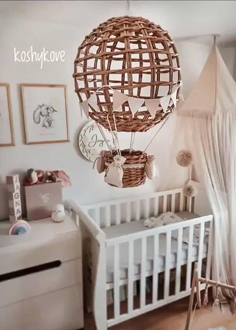 Efektowny wiszący abażur w formie latającego balona z koszem ozdobiony chorgiewkami w dowolnej kolorystyce. Doskonale sprawdzi się, jako prezent dla nowo narodzonego maleństwa. Dekoracja wykonana ręcznie z ogromną dbałością o każdy szczegół, co gwarantuje jej oryginalność i niepowtarzalny charakter.