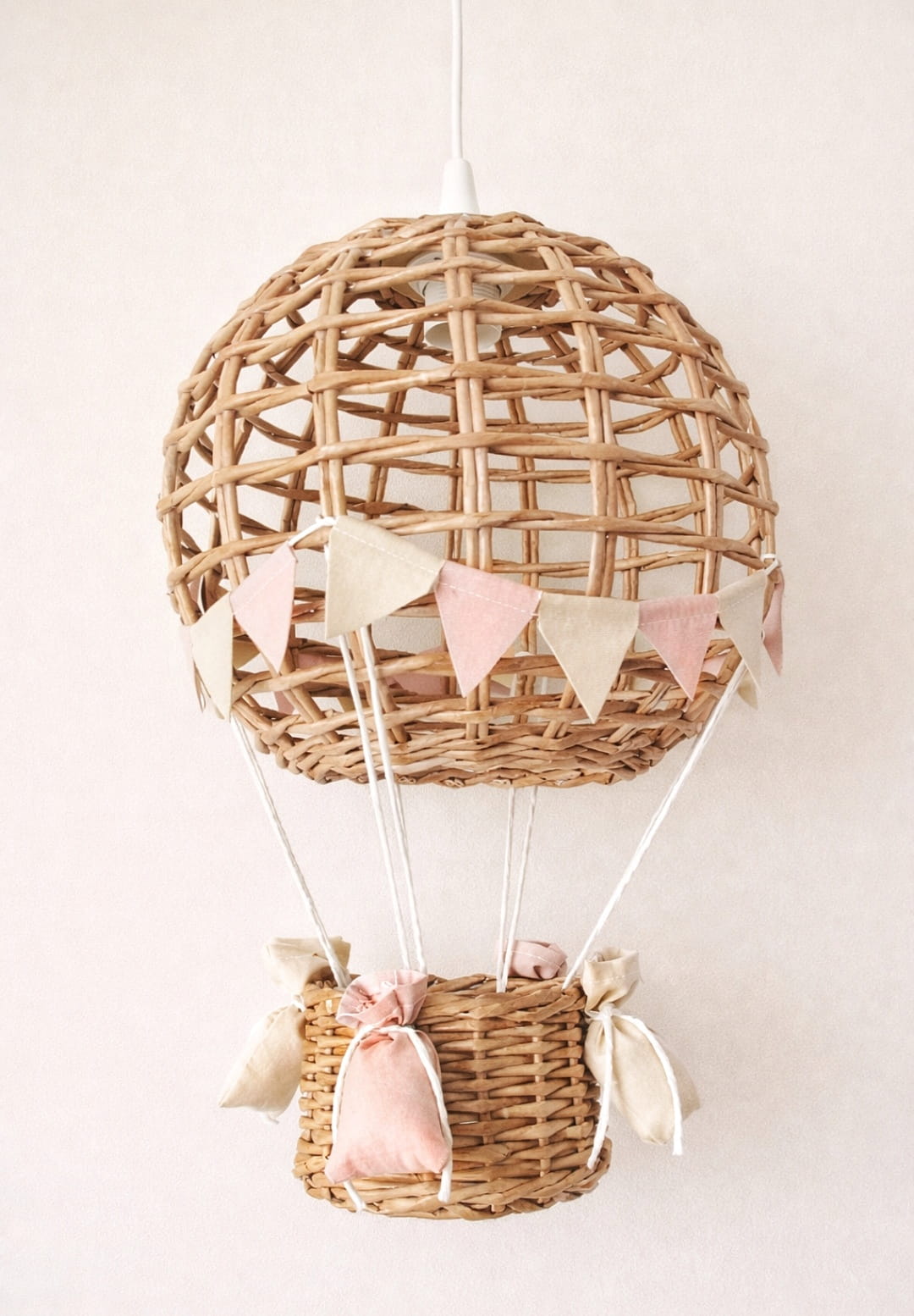 Efektowny wiszący abażur w formie latającego balona z koszem ozdobiony chorgiewkami w dowolnej kolorystyce. Doskonale sprawdzi się, jako prezent dla nowo narodzonego maleństwa. Dekoracja wykonana ręcznie z ogromną dbałością o każdy szczegół, co gwarantuje jej oryginalność i niepowtarzalny charakter.