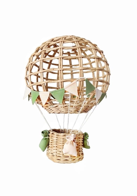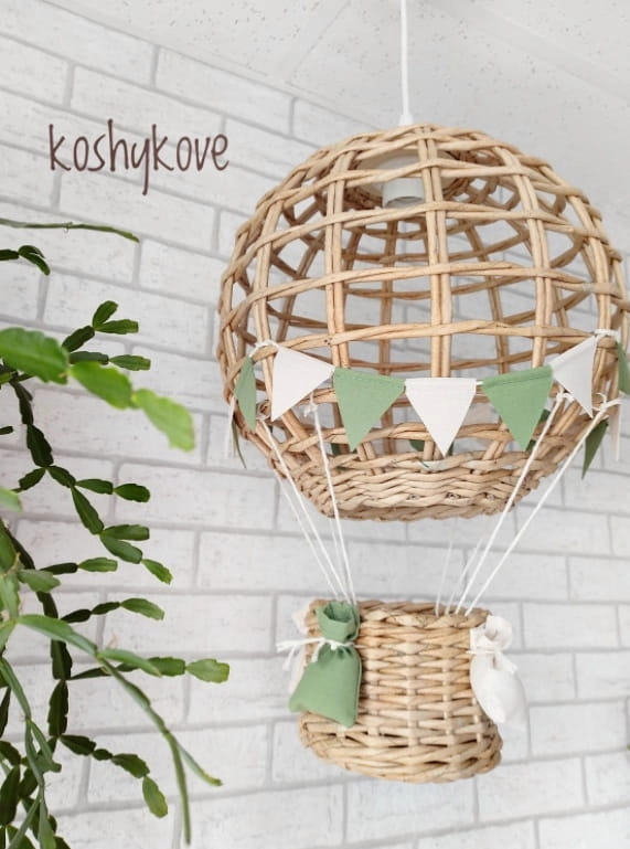 Efektowny wiszący abażur w formie latającego balona z koszem ozdobiony chorgiewkami w dowolnej kolorystyce. Doskonale sprawdzi się, jako prezent dla nowo narodzonego maleństwa. Dekoracja wykonana ręcznie z ogromną dbałością o każdy szczegół, co gwarantuje jej oryginalność i niepowtarzalny charakter.