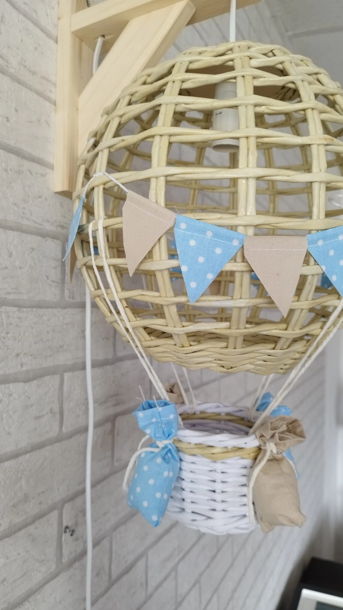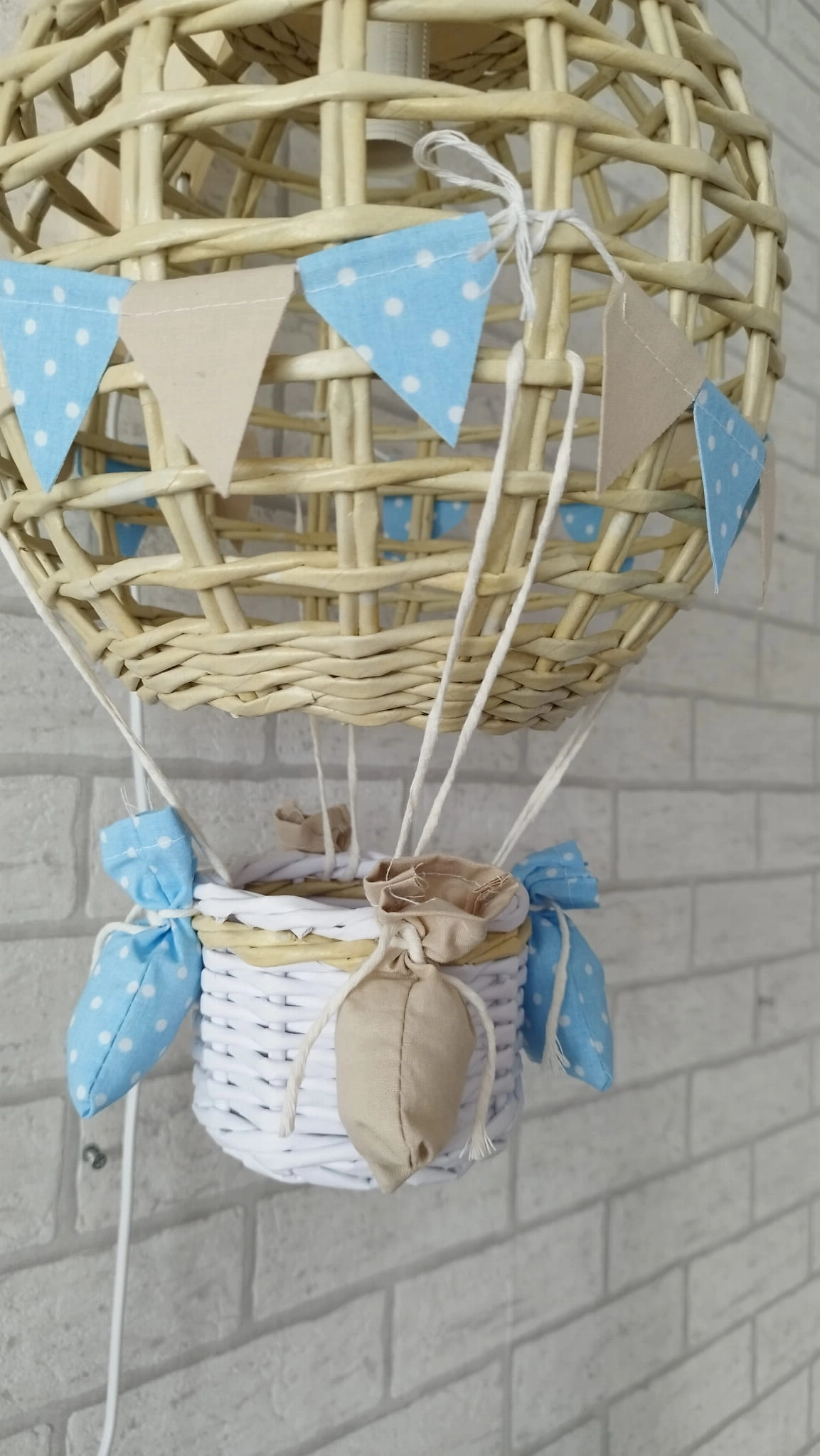 Efektowny wiszący abażur w formie latającego balona z koszem ozdobiony chorgiewkami w dowolnej kolorystyce. Doskonale sprawdzi się, jako prezent dla nowo narodzonego maleństwa. Dekoracja wykonana ręcznie z ogromną dbałością o każdy szczegół, co gwarantuje jej oryginalność i niepowtarzalny charakter.