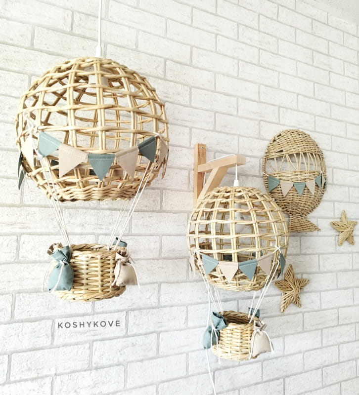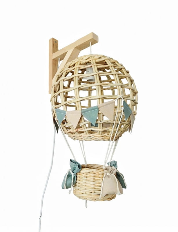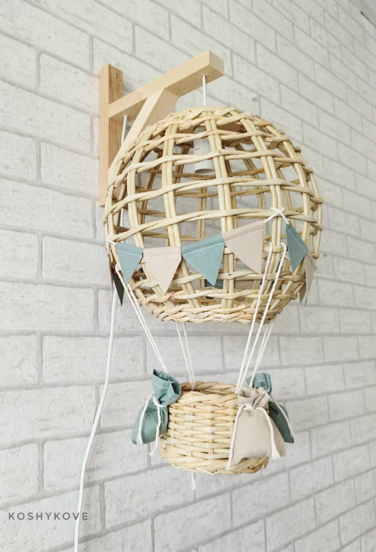 Efektowny wiszący abażur w formie latającego balona z koszem ozdobiony chorgiewkami w dowolnej kolorystyce. Doskonale sprawdzi się, jako prezent dla nowo narodzonego maleństwa.