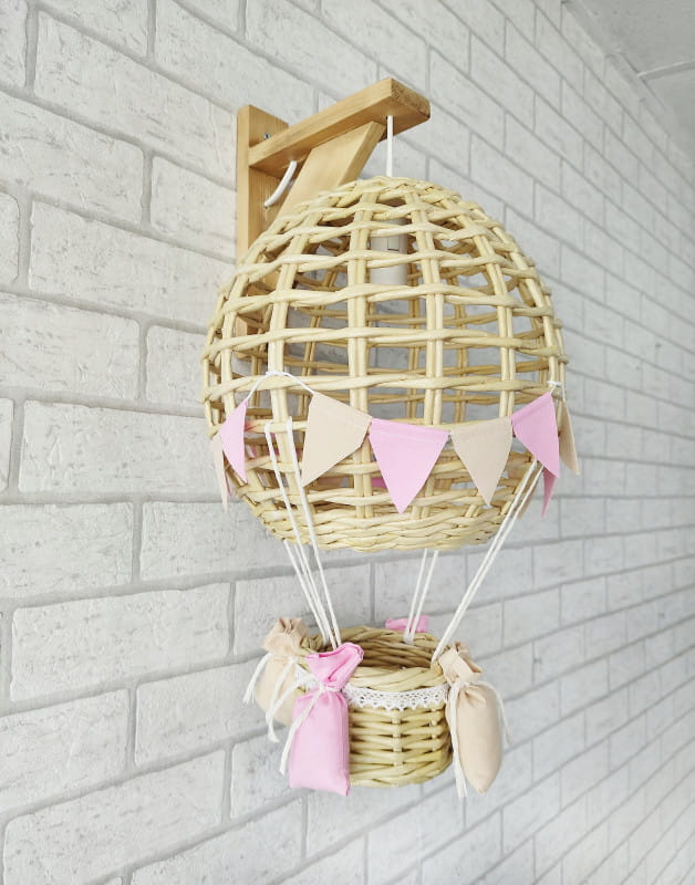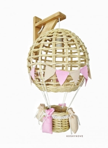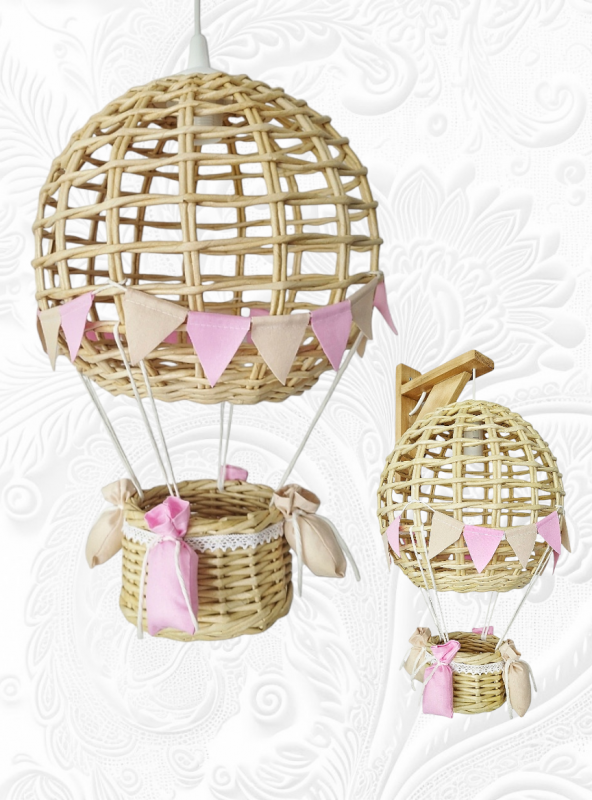 Efektowny wiszący abażur w formie latającego balona z koszem ozdobiony chorgiewkami w dowolnej kolorystyce. Doskonale sprawdzi się, jako prezent dla nowo narodzonego maleństwa. Dekoracja wykonana ręcznie z ogromną dbałością o każdy szczegół, co gwarantuje jej oryginalność i niepowtarzalny charakter.