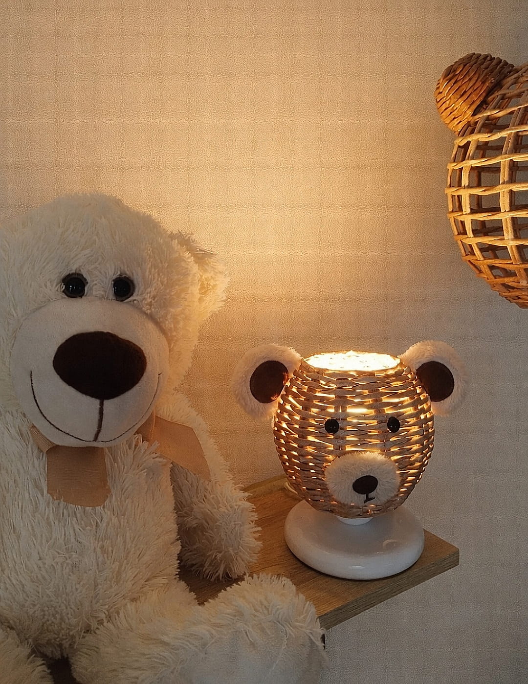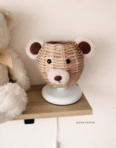Efektowny lampka nocna wykonana z wikliny papierowej z motywem misia. Doskonale sprawdzi się, jako prezent dla nowo narodzonego maleństwa. Dekoracja wykonana ręcznie z ogromną dbałością o każdy szczegół, co gwarantuje jej oryginalność i niepowtarzalny charakter.