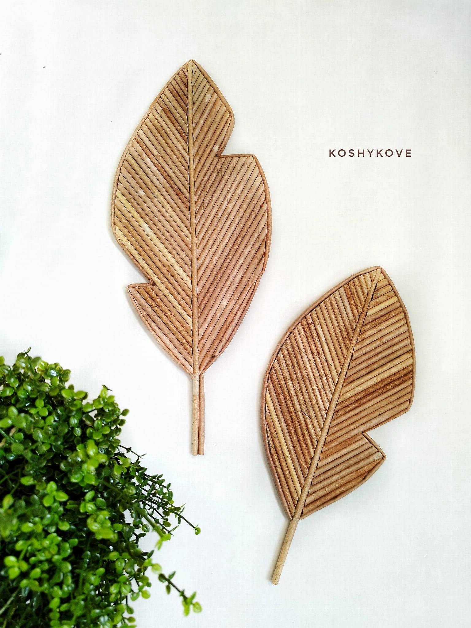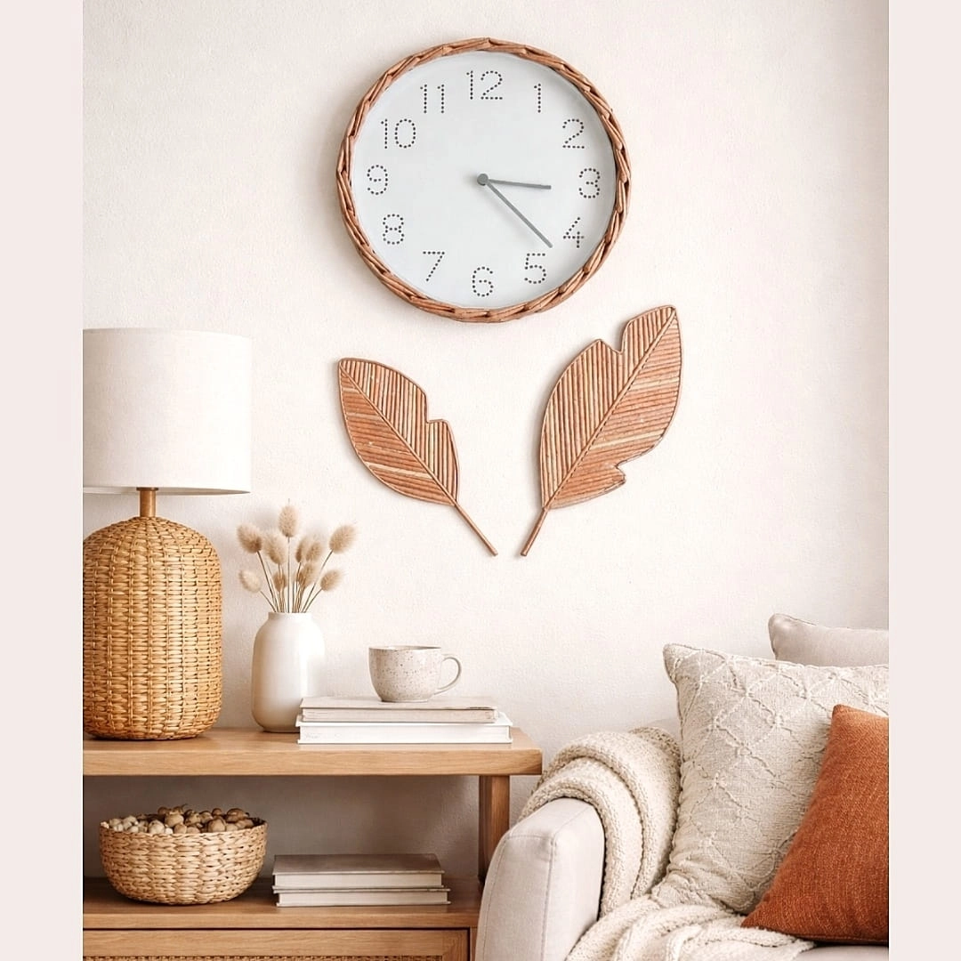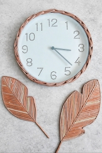 Zegar ścienny natur boho pleciony + 2 liscie dekoracyjne