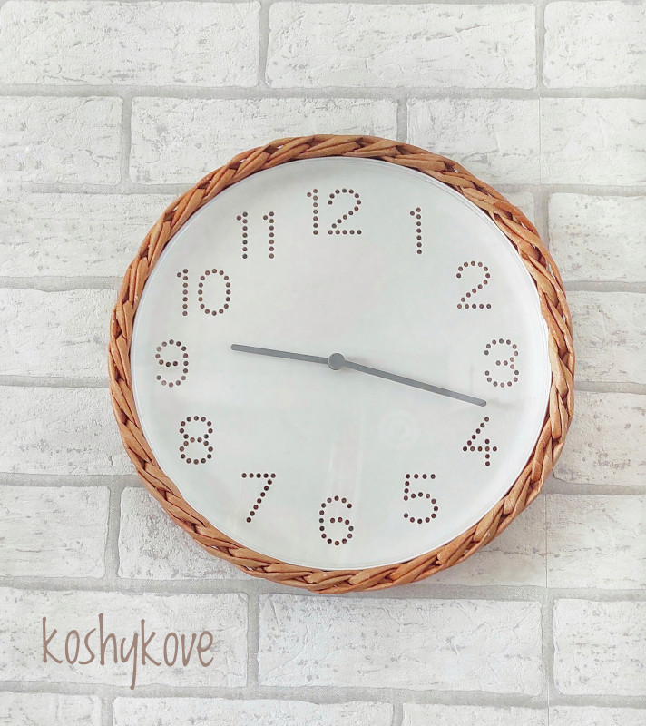 Zegar wykonany na bazie zegara Tromma (Ikea) opleciony ręcznie wikliną papierową zabezpieczoną lakierem akrylowym.